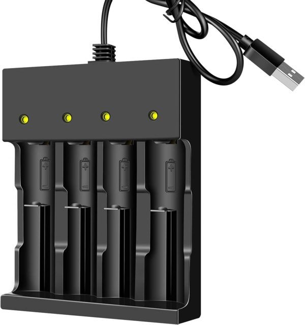 - โปใIntelligent ChargerใUSB Smart Battery Charger 4-Bay Has four independent charging channels, it can charge four lithium batteries at the same time. The charging indicator allows you to clearly understand the charging status of the battery. Red light when charging, green light when fully charged.