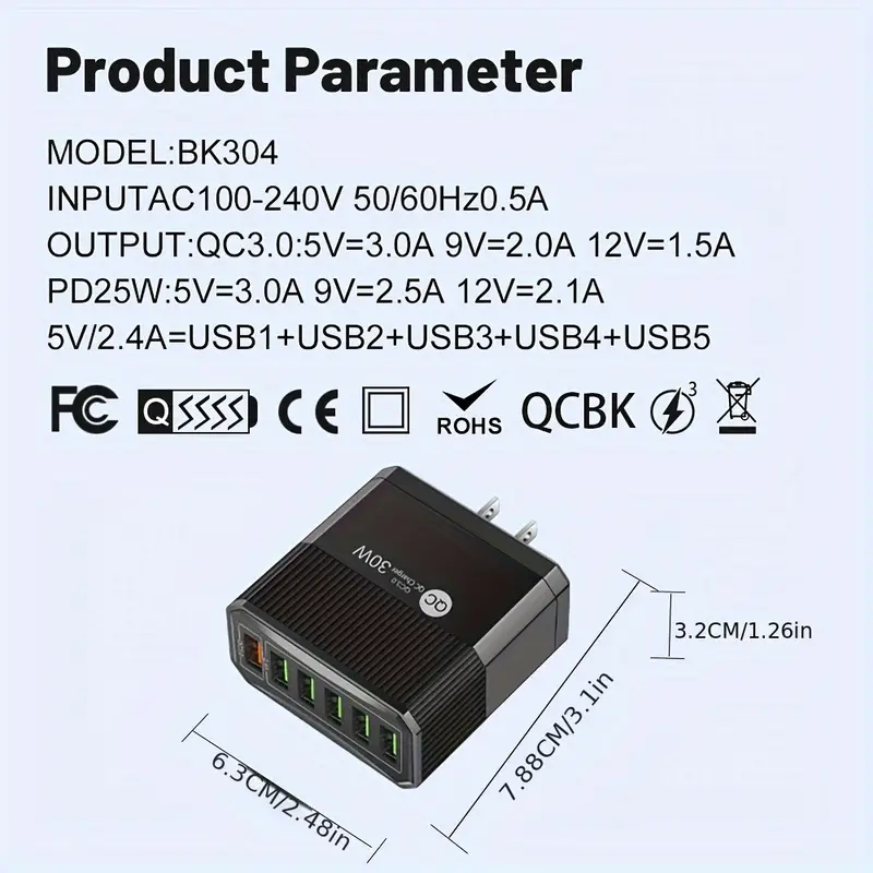 Specification: Material: PC+ABS fire retardant material Power: 30W(6USB) Input voltage: AC 100-240V 50-60Hz 0.5A Output : QC3.0:5V/3.0A 9V/2.0A 12V/1.5A PD25W:5V/3.0A 9V/2.5A 12V/2.1A 5V/2.4A=USB1+USB2+USB3+USB4+USB5 Plug standard: US Plug, Color: Black,White Package included: 1* USB Charger