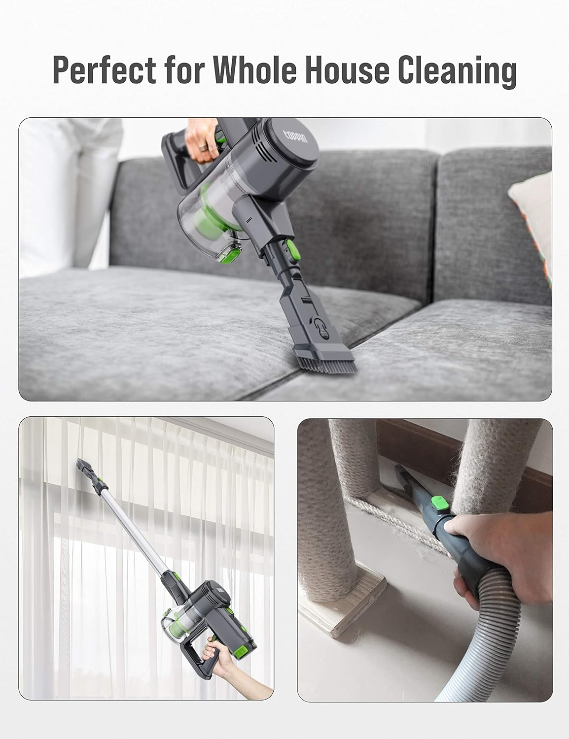 - ใPerfect for Family with Petsใ 250W powerful brushless motor provides up to 23KPa strong suction, capturing pet hair, cat litter, pet food, and other messes in seconds, suitable for hard floor, pet hairs, low-pile carpet, stairs, bed, curtain, ect. TOPPIN cordless stick vacuum cleaner comes with 3 suction modes to meet different cleaning needs.