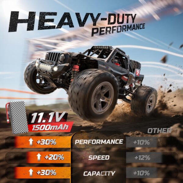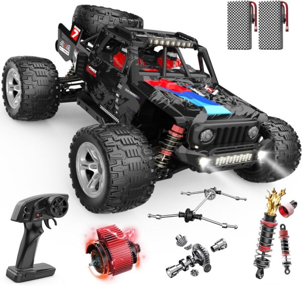 - ใFull Metal Drivetrain โ Engineered for Hardcore RC Cars ActionใThis RC truck for adults is equipped with a full metal drivetrain, including hardened metal driveshafts, metal gear differentials, and a reinforced metal skid plate. Designed to meet the demands of high-performance RC cars, it delivers extreme durability for high-speed bashing, rough terrain, and long-term useโperfect for experienced hobbyists and rugged all-terrain action.