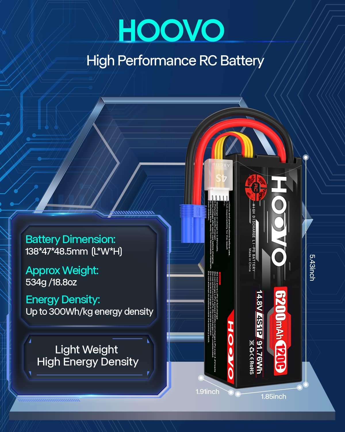 HOOVO 4S Lipo Battery 14.8V 6200mAh 120C RC Battery EC5 Plug Hard Case for RC Car Truck Buggy RC Quadcopter Helicopter Airplane Racing FPV UAV Drone