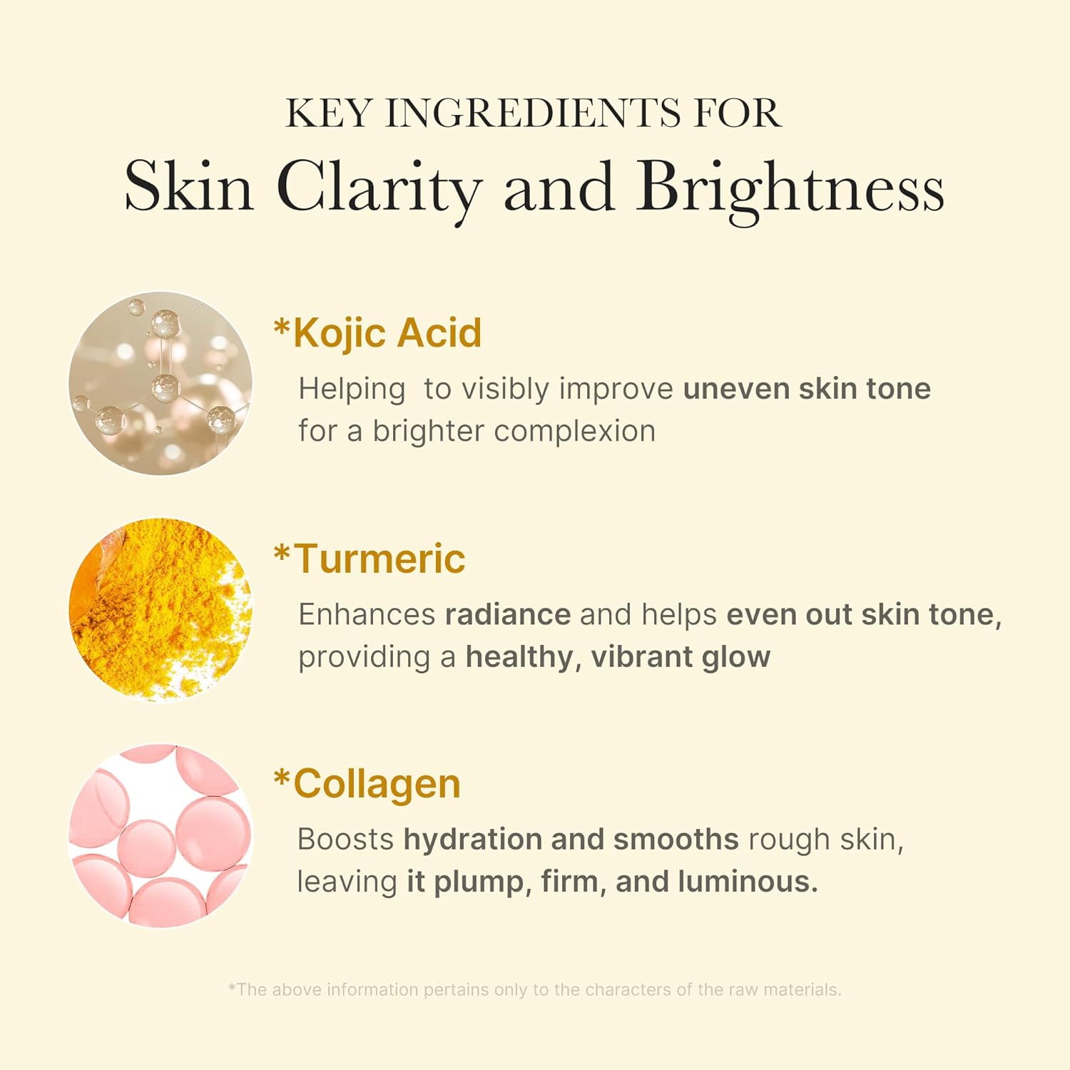 - Powerful Ingredients for Visible Results โ Kojic Acid helps brighten and boost skin radiance, while Turmeric Extract works to refine texture and even out tone for a visibly brighter, healthier-looking complexion. *The above information is related to the characteristics of the raw ingredients only.