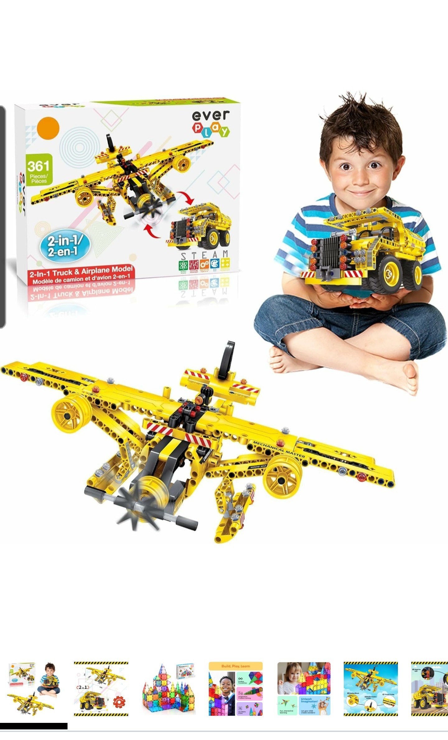 PicassoTiles Magnet Building Tiles+2-in-1 Airplane & Dump Truck, Building Blocks Construction Toy Block Stack, Robot Transforming Engineering Flying Propeller Airplane Dump Truck Engineer