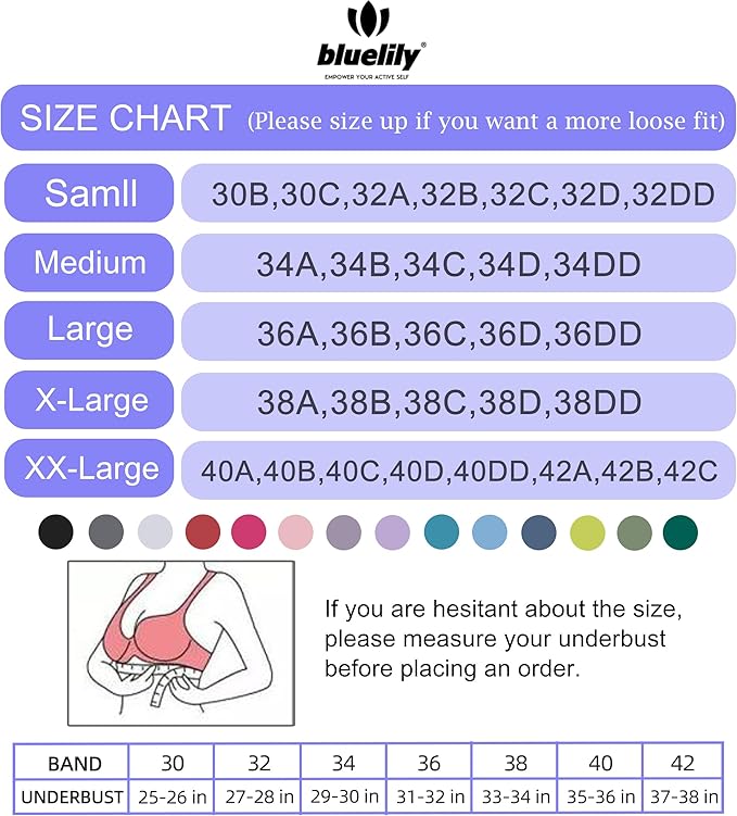 - ใWhat Can You Choose?ใThese medium support sports bras are super comfortable with nice stretch.In order to provideo more options for you,we have designed many color and multiple packge,you can choose according to your needs. The size of these strappy sports bras for women is as follows:S(30B,30C,32A,32B,32C,32D),M(32DD,34A,34B,34C,34D),L(34DD,36A,36B,36C),XL(36D,36DD,38A,38B,38C),XXL(40A 40B 40C 40D 40DD 42A 42B 42C).Please note:Hand wash and air dry is recommended for longer life of the fabric