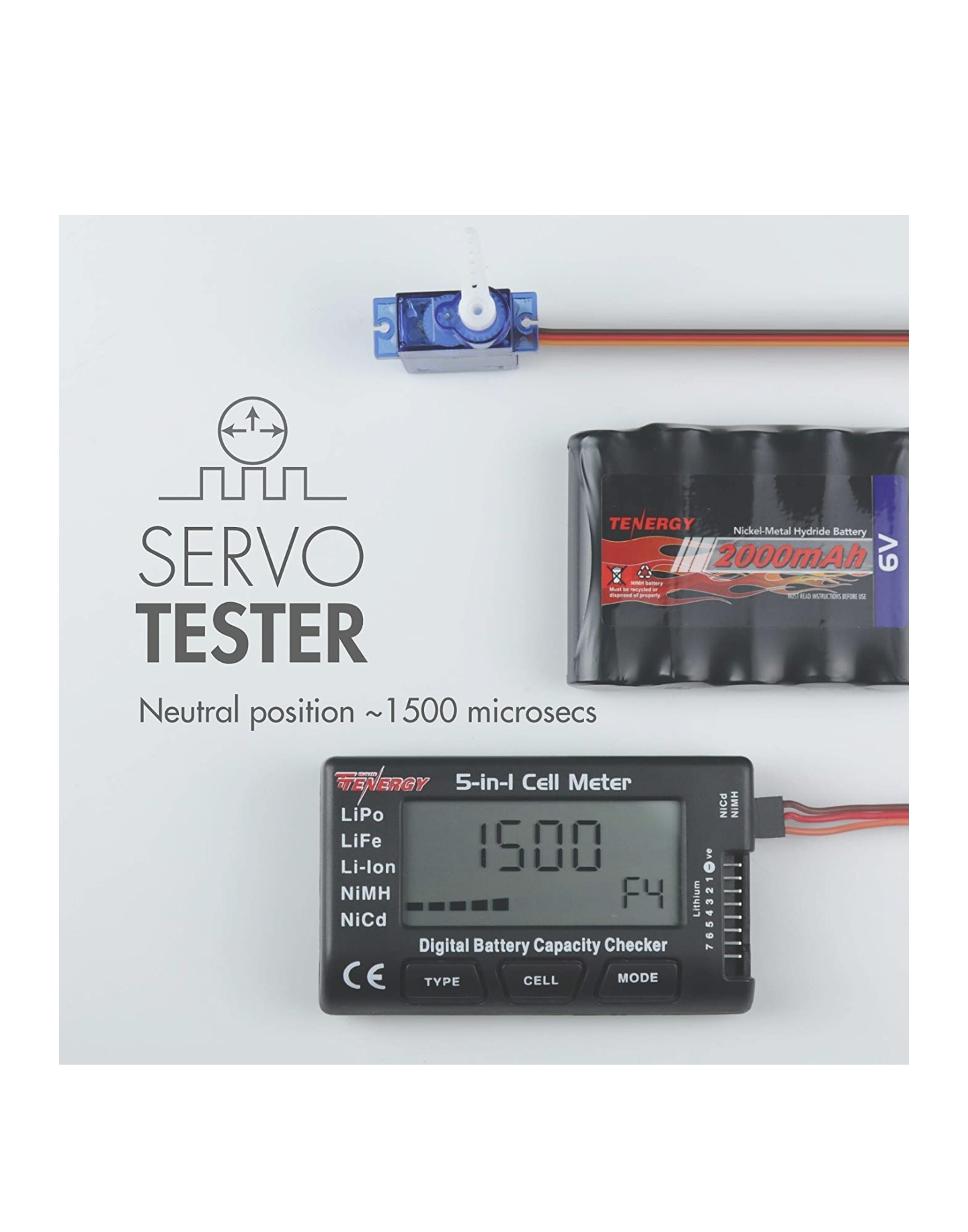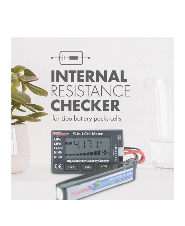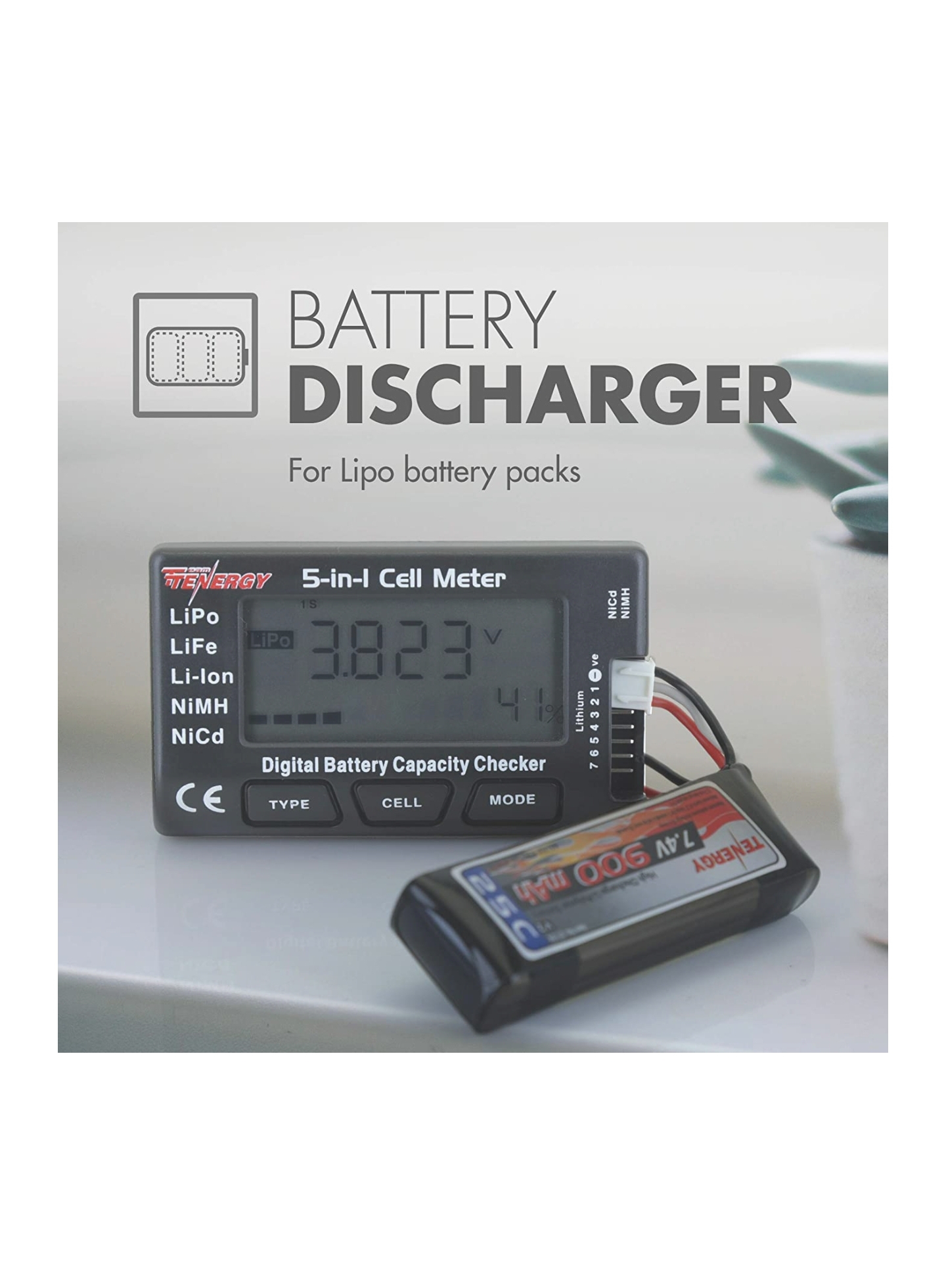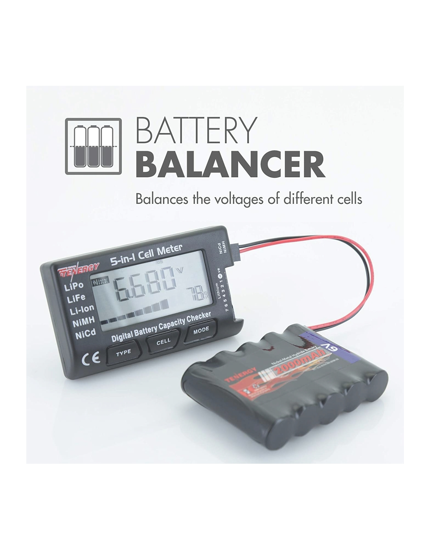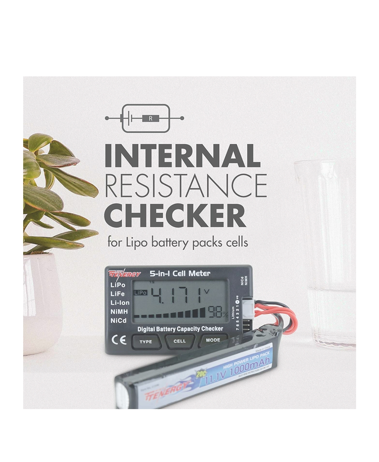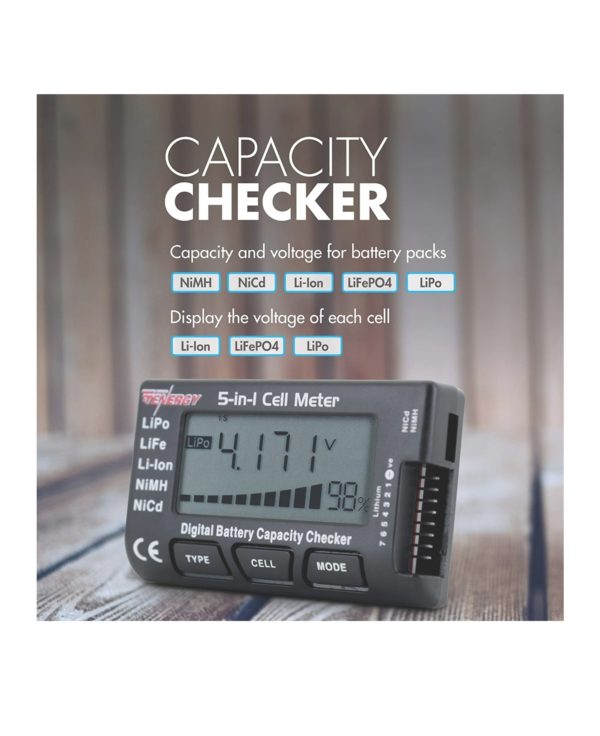 - Multi-purpose battery meter – The Tenergy 5-in-1 cell meter estimate voltages for LiPo/LiFePO4/Li-ion (2-7 cells) packs and NiCd / NiMH batteries for TX and RX (4-7 cells). The battery capacity checker requires no additional accessories and is powered by the testing battery pack to quickly evaluate the pack’s capacity.