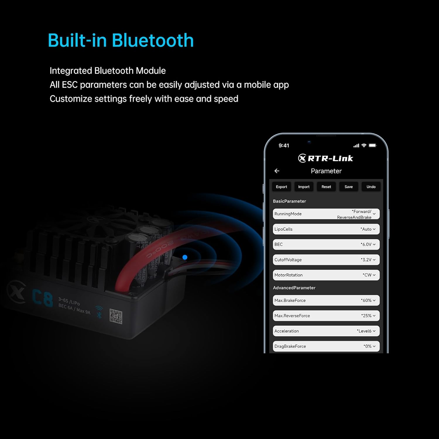• 【Built-in Bluetooth】This BLDC ESC can be connected to Mobile App directly via built-in Bluetooth.Parameter programming can be done conveniently and fast.No need of additional modules like Bluetooth module and programming box or card